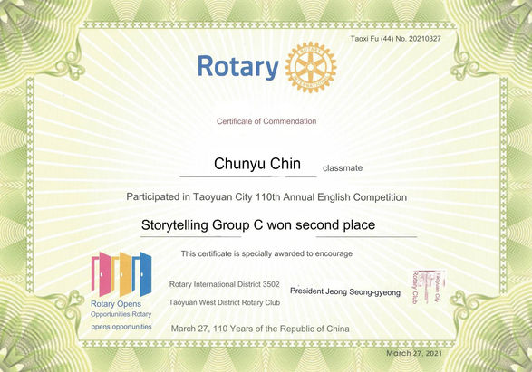 English Storytelling Competition (5th Grade) - Represented school to compete with elementary schools in Taoyuan city